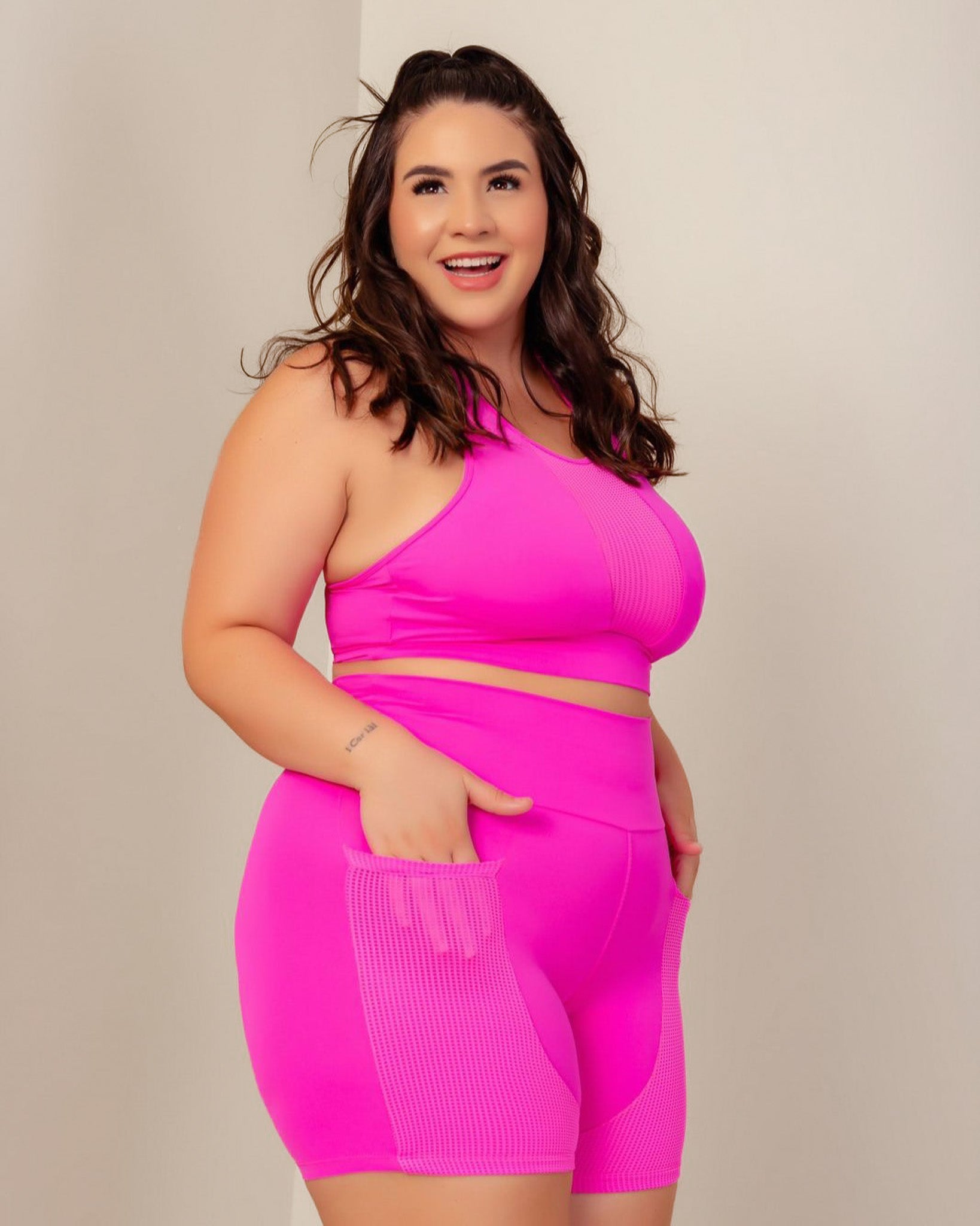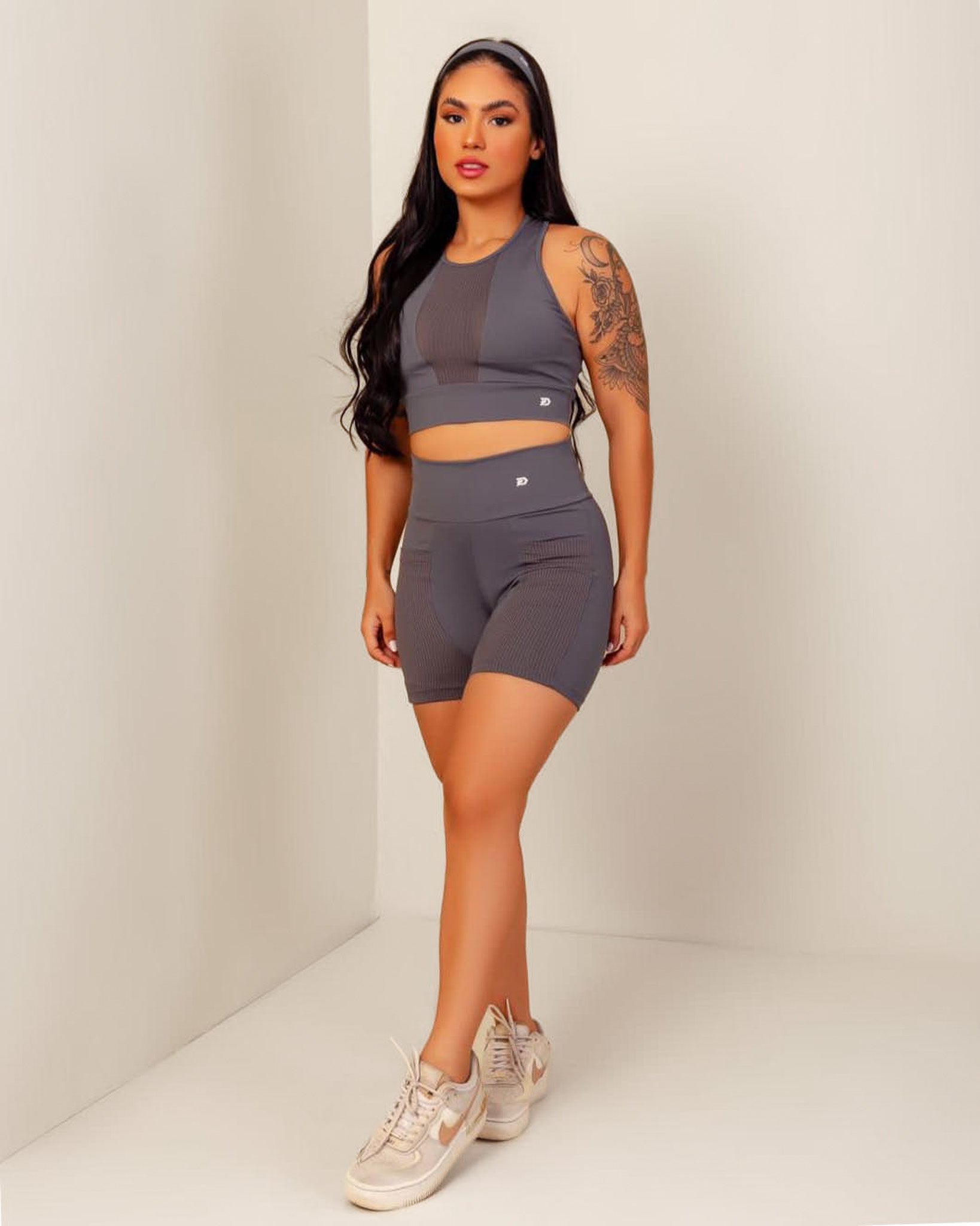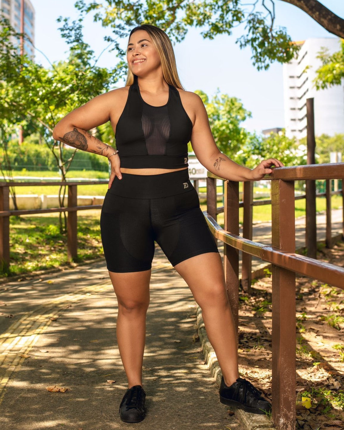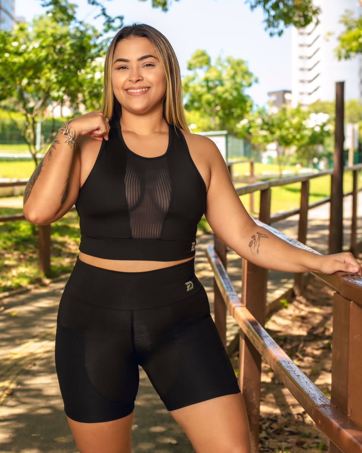 O conjunto de treino Hayane é a escolha ideal para aliar conforto e proteção nas atividades físicas. Com tecido de poliamida e proteção UV+, é resistente e perfeito para treinos ao ar livre. O top destaca-se pelo detalhe em tela no decote e nas costas, oferecendo um toque moderno e respirabilidade extra. O short prático inclui bolsos frontais, ideais para levar pequenos itens essenciais sem comprometer o movimento e o estilo.